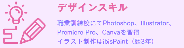 3年前からの趣味イラスト制作をきっかけに、「もの作りが好き」「ものを作る仕事をしたい」という気持ちから、職業訓練色彩舎ソリューション Webデザイン制作科にてWebデザインやコーディングについて学ぶ。
